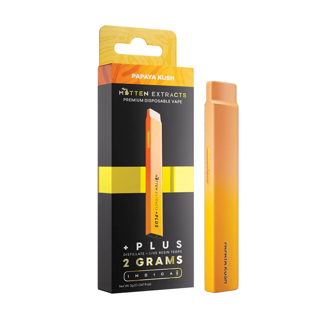 Elevate your vape experience with the Mitten Extracts + Plus Disposable Papaya Kush a flavorful, potent, and ultra-convenient way to enjoy high-quality cannabis extracts anytime, anywhere.