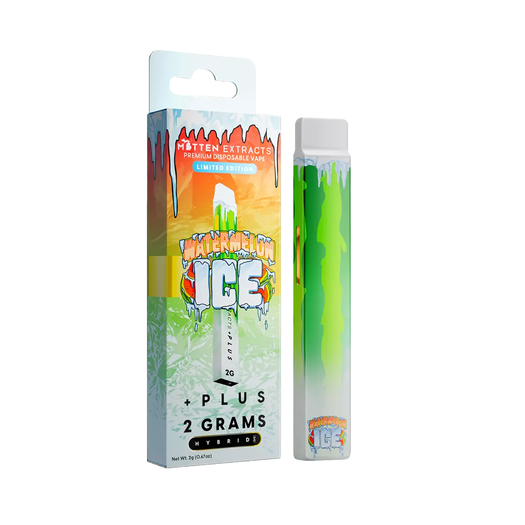 The Mitten Extracts + Plus Disposable – Watermelon Ice 2g delivers a juicy burst of watermelon flavor combined with an icy, refreshing finish. Crafted with Mitten Extracts’ premium distillate and enhanced “Plus” hardware, this 2-gram disposable provides powerful performance, smooth vapor, and long-lasting satisfaction perfect for everyday use.